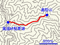 2020年9月28日(月)晴 風張峠駐車場1323…1344倉掛山1349…1412風張峠駐車場 (1146) 21 (1078) 23 (1146) 体力度A 神経度A (歩行合計約0時間50分) 【GPS記録】距離2.3km ◇5万図 五日市倉掛尾根は、以前浅間尾根を登った時下りに通る予定だったのですが、奥多摩周遊道に出たあたりで突然の雷雨。予定変更で逆方向の都民の森へ避難しに。ところが月曜休館で、雷にビビりながら数馬に下るはめに。倉掛山はその上部近くのピークで、「東京都の山」(1994年 分県登山ガイド 山と渓谷社)にも1項目取って紹介されています。しかし、バスの乗車時間が長い割に地味なピークで、この山のみ登りに行く意欲がそれほど大きくならなかったので、この本に紹介された日帰りの山としては唯一登り残していました。 ところが最近、藤倉から尾根上の倉掛集落に登る車道が奥多摩周遊道・風張峠駐車場付近まで伸びていることをネットで発見(林道風張線)。しかも、全区間舗装道。なら、愛車スーパーカブ110で行くしかない。 と言うことで先日出かけてみると、登り口に「通行止」表示。(去年の東日本台風の影響ではなく今年の大雨の影響で、復旧は来年とのこと。) 奥多摩周遊道側にはゲートがあって、関係車両しか通れませんが、歩行者は通れますし、地図を見ると風張峠駐車場から倉掛山まで1km程なので、今回、こちらから往復することにしました。 風張峠駐車場前で奥多摩周遊道が倉掛尾根上部を乗越しており、サイクリスト達はここを「風張峠」と呼んでいるようですが、本当の風張峠はここから100mくらい北西の主稜上の鞍部にあるものと思われます。車道が出来て、そちらに峠名が移るのはよくあることですが、主稜を東西に跨ぐ峠の名が主稜の東側しか通らない道に移ると言うのはあってはならない話だと思います。風張峠駐車場から本当の風張峠より近い峠なので勘違いしたのではないでしょうか。尚、この峠の標高1146mは都道の最高点と思われます。 駐車場から奥多摩周遊道を渡って林道風張線へはゲート脇の隙間からでも入れますが、正式な歩行者通路は僅か数馬寄りにあります。三段ほどの低い階段なので、自転車なら担いで進入できそうですがカブは無理です(^^;。 入るとすぐ左・小径と右・林道風張線に分かれますので小径を行きます。僅かに登った後下って行くと林道に合流、その先も倉掛山手前の鞍部まで下りです。鞍部手前では右手南東面の視界が開けて、大岳山、浅間尾根、笹尾根方面が目立ち、また、足下から始まる谷の遙か先に東京西部の市街地も望まれます。 林道風張線から浅間尾根方面の展望。鞍部付近から左手登山道に入り登って行きますが、3分程で倉掛山山頂です。これだけあっけないとカブで鞍部付近まで来られなくて却って良かったと思うくらいです(^^;。 山頂には木に私製と思われる山名標識が取り付けられているのみで、切開きもなく、勿論展望皆無。小休止して近くを少しうろついたのみですぐ下山。 倉掛山山頂。林道に出たら復路は小径に入らずそのまま奥多摩周遊道まで行きました。林道の方が更に起伏が小さいし、歩きやすいので楽です。倉掛山より風張峠駐車場の方が標高が高いので復路の方が登りは大きいですが、たかが知れてます。(標高差は、鞍部付近−倉掛山が30mほど、鞍部付近−風張峠駐車場が100m程です。) 風張峠駐車場へは奥多摩湖側から登って来ましたが、帰りは数馬側へ下りました。交通量(特に二輪)はそこそこありましたが、月曜日なので、やはり都民の森は休館で駐車場も閉鎖されていました。 登り残していた倉掛山の登頂と言う意味では永年の懸案も解消されましたが、倉掛尾根は上部しか歩いていないので林道風張線が復旧したらカブで全線を往復したいです。 ▲項目索引▲ ◎トップページへ戻る◎ |