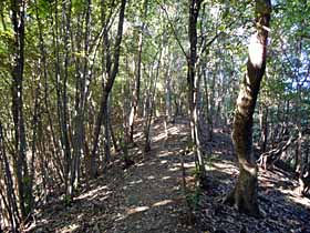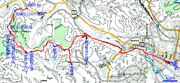 2020年11月4日(水)快晴 飯能駅0837…茜台自然広場入口0926…1006赤根峠1010…1032柏木山1108 (107) 49 (150) 40 (210) 23 (・303) …榎坂配水場1134…大政山入口1147…小岩井石松山1220…小岩井次郎長山1231 26 (213) 13 (192) 33 (297) 11 (・329) …第3の右折点1240…末端の220m圏峰1257…1316小瀬戸BS 09 (290) 17 (223) 19 (140) 体力度A+ 神経度A+ (歩行合計約4時間10分) 【GPS記録】距離10.6km ◇5万図 川越柏木山は龍崖山経由で登るのが定番ですが、今回は前後に筆者未踏のルートを組み合わせてみました。 飯能駅から西へ割岩橋を渡って<28>に入り、大河原の三差路では右折すべきところそのまま行ってしまい100mくらい遠回りで八耳堂方面へ。「龍崖山コース入口」及びその先の八耳堂の龍崖山登山口を見送り、次の三差路で左に折り返すように茜台へ登って行く道に入ります。まもなく右手に駐車場があり、その手前が茜台自然広場入口。 右に折り返すように始まる遊歩道を行くと小尾根を回り込んで谷にある茜台自然広場に着きました。メインルートはこの谷を詰めて行くようですがすぐに右手に「柏木山ジャンダルムトレイル」と標識のある尾根への分岐発見。谷より尾根の道の方が好きなので入ってみました。 ジャンダルムトレイルはいい感じの尾根道。ひと登りすると尾根末端の展望地で、通ってきた車道が見下ろせます。雑木の尾根道はハイキングコースとして整備されていて杉などの植林帯と違って木漏れ日が明るくていい感じ。小さなコブにいちいち「ジャンダルムU」とか「飯能南アルプス ジャンダルム」とか大げさな山名表示があるのはご愛敬。間もなく、左手の谷を登ってきた本線と合流。赤根峠(現地の案内板では赤根ヶ峠)を目指します。 左下に茜台の工業団地を見ながらすいすい行けば赤根峠到着。何本か分岐の指導標はありますが「あれ?柏木山への尾根道がない。!」右往左往した後地図を確認して見ると、柏木山への尾根道分岐は先ほどの合流点の近くでした。そう、今日の柏木山登山ルートに赤根峠はなかったのです。超低山だし、何回か来てる山だし、しっかりした道だし、という事で地図の確認を怠った状態で、「柏木山は赤根峠の西」という概念で、とりあえず赤根峠を目指してしまっていたのでした。分岐点まで戻ります。 分岐点から赤根峠までは片道8分ほど。右往左往+確認を含めて往復で20分ほどの寄り道となりましたが、時間も体力もぎりぎりというコースではないので、むしろ久々に赤根峠へ行ったのは意義ある寄り道だったとも言えます(^^;。尾根が分岐するわずか手前から左にショートカットがあったのでそちらを経て柏木山への尾根道へ。 ここ以降、当分は右手のゴルフ場の金網柵沿いに歩く事になります。ちょっとした登りを頑張れば柏木山山頂。東〜南面が伐採されて大展望が広がっています。よく見える山々は、奥多摩・奥武蔵ですが、富士山も、馬頭刈尾根の上にチョコっと見えます。勿論、関東平野、筑波山も。 柏木山山頂より川苔山・蕎麦粒山方面。弁当を食べ展望を十分楽しんだら出発、引き続き尾根を辿り、榎坂配水場の脇から車道に出ます。ここは車道の峠に当たる所で、前回はこの道を北側(名栗川側)へ下りましたが、今回はここから先の尾根が第2の目的地です。 「サンタ山」の標識に導かれて山道を登って行きます。ひと山超えて下るとまた車道に合流。しかしすぐに、「はんのう南アルプス」の標識から山道に入れます。僅かに登った所で道が判然としなくなったので、右にトラバースしてゴルフ場の金網柵沿いに登ったら少し先で明瞭な道に合流。「小岩井大政山」標識のピーク(約270m)の後「小岩井小政山」の標識がありますが、なぜかその標識は細長い頂稜部の南東端にあり、道はその奥の最高点(約290m)は踏まず僅か左を巻いていました。この辺りからゴルフ場の柵は金網ではなく有刺鉄線の部分が多くなります。 ゴルフ場の金網柵沿いに急登。次の「小岩井石松山」で右折。この辺りは初めて柏木山へ来た時に歩いた東都カントリー倶楽部の正門へ続く車道のすぐ東を並行しています。「小岩井大五郎山」(約310m)を過ぎて、その先「小岩井次郎長山」でも右折。更にその先にも右折点があって、その後高度を落とし、尾根末端の220m圏峰に登り着きます。 ここからは標高差70m程を下るばかりですが、道はすぐ見失い、もう尾根ではなく円錐状の地形なうえ、ゴルフ場の柵もなくなり、どこを通ったらいいか判りません。今まで右手の柵を目印にして来た習性で、尾根の延長方向より東に向かってしまいましたが、ここまで来たら民家や施設の敷地ではなく里道に安全に出られればOKです。 墓地の上部に出て安堵。やがて、墓地の上部に出ましたのでそそくさと墓地内の道を下って脱出、車道に出ることが出来ました。少し右に行くと左手路地の奥に名栗川に架かる赤い歩道橋を発見。これ(弁天橋)を渡ると<70>に出て、すぐ右手にバス停「小瀬戸」がありました。 筆者未踏の領域にも指導標や山名標
