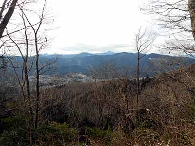 四阿には3人組の先客がいて、煮炊きをしていたので南側外で弁当タイム。青梅周辺の市街地が見下ろせ、また三室山やその奥に雪のある大岳山も望めました。 矢倉台より三室山・大岳山方面を望む。