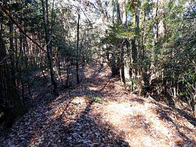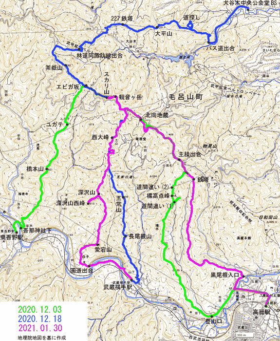 2021年1月30日(土)快晴 高麗駅0854…黒尾根入口0908…1000鉄塔1009…主稜出合1017…北向地蔵 (108) 14 (99) 52 (340) 08 (365) 17 (・377) …1051スカリ山1101…西大峰1125…1157深沢山1208…深沢山西峰1215 17 (△434.9) 24 (397) 32 (344) 07 (△313.1) …1248愛宕山1256…国道出合1313…1324武蔵横手駅 33 (251) 17 (122) 11 (113) 体力度A+ 神経度A+ (歩行合計約4時間10分) 【GPS記録】距離11.0km 【地理院地図累積標高差】上り801m 下り796m ◇5万図 川越最近、お手軽な場所にありながら個人的に未踏だった奥武蔵高原主稜のスカリ山周辺とR299を結ぶ支尾根を歩いていて、20.12.03には関ノ入左岸の尾根と飛脚道を、20.12.18には関ノ入右岸の尾根を歩いています。今回は、関ノ入左岸の尾根の上部から東側に分岐する黒尾根を登り、関ノ入右岸の尾根の中間から西側に分岐する深沢左岸の尾根を下る事にしました。今回もこの近辺で唯一めぼしいピークであるスカリ山には寄って行きます。(文中※は帰宅後調べて得た知見) 黒尾根の末端部は熊手のように開いて枝分かれしていますが、ネットの記事でよく歩かれているのは井尻谷(駒高へ登る林道が通る谷)寄りのようですので、そちらを目指します。高麗駅からR299を西進し、高麗川を渡ったら折り返すように右折して左岸沿いの道を進み、林道が分岐するまでの間で登山道の入口を探す算段。位置は地図上でチェックし、ストリートビューで周りの様子も見ておきましたのでたやすく見つかりました。入口右側のコンクリ壁上部に「←小瀬名、物見山 コースタイム60分」と書かれた札が張り付けてありましたが、小さくてよく見えません。 黒尾根に入って10分くらい登った所(標高約160m)の道。尾根道に入ると、まずはいい感じの緩い登りが続いて、きつさを感じることなく着実に高度を稼げます。やがて左へカーブして尾根末端の小尾根群が収束する扇の要的ピークへ向かいますが、その手前で目印に促されて右折、ピークは巻いて尾根に乗ります。(直進すると黒尾根を乗越してしまいます。) 一本にまとまった尾根を行く道は軽いアップダウンがあって登りと言うよりは縦走の雰囲気。それでも少しづつ高度をを稼いで、やがて登り道らしくなると鉄塔下へ。 十分な高さがあるせいか、送電線方向の切開きがないので展望皆無ですが、最初の休憩としました。鉄塔名をはっきり書いた大きなプレートはなく、小さく「新所沢線」の下に縦書きで「六六」とありましたから、「新所沢線 66号」鉄塔なのかも知れません。 鉄塔下の少し先で関ノ入左岸の尾根から来た道と合流。その少し先で奥武蔵高原主稜に合流。関ノ入左岸の尾根を登った時と比べてやけにすんなり主稜に達した感じです。 主稜沿いの道を進めば406m峰を巻いて、狭い切通しを通って舗装道(奥武蔵グリーンライン)に出合います。正面の小道に入れば一山越えて北向地蔵ですが、今回は舗装道を行きました。 舗装道は登り基調で北向地蔵まで30m程高度を上げます。その先、左の410m圏峰を巻いて西大峰方面への道を見送れば右手にスカリ山入口。これを登り、観音ヶ岳を経てスカリ山へ。今回、スカリ山直下の尾根道を見逃して南へ巻いてしまいましたが、南からも明瞭な道があり、問題なく登頂。 スカリ山から越上山方面を望む。本日のコース中では一番の展望地ですが、冷たい風がきついし、土曜日なので人の出入りもあって、あまり長居する気は起きません。それは予想されたことなので今日の昼食には米の飯の弁当ではなく容器等が風に煽られて飛ばされる心配がなく、手早く食べられるサンドイッチを飯能駅で購入して来ました。食事後休憩は早めに切り上げて出発。 尾根を東へ下り、観音ヶ岳は巻いて、後は登ってきた道を下ります。グリーンラインに出てからも少し戻って410m圏峰を右(西)側から巻く小径に入ります。次の鞍部からは左側を巻く道を通りましたが、前回は尾根道を登ってきたので少し不安に。しかし間もなく合流し、前回の逆コースを行きます。 西大峰(土山ノ峰)からの下りでは道が不明瞭になり、木に巻かれた赤テープを頼りに進みますが、前方の傾斜が増す所(360m等高線付近)で次のテープが見つかりません。方向的には正面ですが、道のない急傾斜を下るのは怖いし、尾根より左へ下っても少し下に沢山峠で尾根道と交差する山腹道が通っているのが分かっているので、左へトラバースして、踏み跡っぽい所、歩き易そうな所を拾って下ることにしました。 左へ行き少し下って右へ行ったら無事尾根道に合流出来ました。正解の尾根道は赤テープを見失った場所からやや右の前方だったようです。前回、登りの時は上を目指せばいいのですんなり行けたのですが、尾根線がはっきりしない下りは目標がなくて迷い易いです。 沢山峠の先で関ノ入右岸の尾根の道と分かれて指導標に「深沢山 水晶山 愛宕山」とある方面の尾根道へ。ここから先、道は非常に明瞭でした。 やがて登り着いた350m圏峰には「深沢山」の山名標識がありました。ベンチもあり、