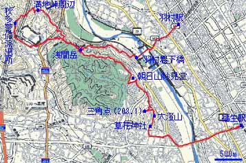 2021年10月23日(土)快晴 福生駅0951…草花神社1029…1034大澄山1048…三角点1056…1143浅間岳1150 (131) 38 (174) 05 (・192) 08(△203.1) 47 (△235.2) …1220満地峠周辺1232…1248秋多警備派出所1251…1325浅間岳1332 30 (218) 16 (195) 34 …羽村堰下橋(西端)1353…羽村駅1411 21 (126) 18 (145) 体力度A+ 神経度A+ (歩行合計約4時間00分) 【GPS記録】距離11.7km 【地理院地図累積標高差】上り504m 下り490m ◇5万図 八王子急に少し寒くなって低山の季節到来。朝起きて、一日中晴の予報だったので軽いコースを物色。20年ぶりに羽村草花丘陵に行く事にしました。ここだけでは散歩に毛が生えた程度なので+α。尾根道を満地峠の西まで辿り、警察施設(弾薬製造所「警察庁秋川工場」)の東縁に接する道を下って可能なら中を垣間見て、その正門を警備する秋多警備派出所まで足を延ばす計画にしました。以前二ツ塚峠から浅間岳まで辿って来た時、尾根道沿いの金網の中の監視カメラや「構内の警察犬に注意」の表示が気になっていたので、脇の道も通ってみようと。(文中、「地図」は地理院地図を指し、※は帰宅後調べて得た知見です。) 福生駅から広い通りを西進、永田橋を渡ります。右前方に大澄山方面の青垣が見えます。 永田橋より大澄山方面。橋を渡り終わったら斜め右へ入り、300mくらい先で左折後、更に350mくらい先で右折して住宅地の道を進むと正面に草花神社の石段が現れます。 やや長めの石段を登れば質素な社殿の前へ着き、振り返れば丹沢や富士の山々が望めます。この後、あまり山が広く見える場所はなく、結果的に本日一番の眺望でした。 草花神社より丹沢や富士の山々。尾根道を少し登って行けば大澄山。四阿やベンチ・テーブル完備の整備された山頂ですが、展望は殆どないですし、この時期、桜も紅葉もないので、ただ休憩するだけ。ここで早くも弁当タイム(^^;。 大澄山山頂。浅間岳へのミニ縦走開始。すぐ先で縦走路から左へ外れてトラバース気味に登り、前回見送った203.1m三角点峰へ。この季節、ここも展望は良くありません。下りは三角形のオブジェの前を通り、尾根道で縦走路へ。 縦走路に復し、すぐに指導標が浅間岳へは右へ階段を下るように指示していますが、どう見ても直進が尾根沿い。もしこの先に通行止めとかあって引き返しても大したことないのでそのまま進みますが、何の問題もなく竹林を通って広めの車道(<250>)に下り着きました。 突き当たった車道の対面に指導標と小径の入口が見えましたので車道を渡るのですが、こちら側の歩道と車道の間のガードレールに切れ目がありません。左右見ても近くになし。仕方なく、ガードレールを乗越えて横断。 指導標は浅間岳方面は小径を指していますが大澄山方面は明後日の方向。ガードレール共々、こちらからも大迂回させる気満々。 小径を登って行くとゴルフ場越しに大岳山が見えました。すぐに下って次のピークとの鞍部に出ましたが、ここの指導標が浅間岳方面を示すのは目の前のピーク方向の道ではなく左。住宅地の舗装道ですがすぐに右折の小径が現れると思っていたらそのまま別の車道に突き当たり、それを左折して稜線へ復帰。右には巻いたピークから降りてくる道が。つまり、「l」で行けた所を「<」に迂回をさせられてしまったわけです。(※しかも地図で確認すると、1辺だけの比較でも通らなかった辺の方が短い。最悪なのは、巻いピークがが前回巻いてしまったために今回は通ろうと思っていた朝日山妙見堂のピークだった事ですT_T)。) その先、縦走路はゴルフ場の縁に沿って行きます。途中、グリーンエッジから10m、ピンから20m位しかなさそうなのにネットがない場所も通り、ビビります。浅間岳まで小ピークをいくつか越えて行くので意外ときついです。 浅間岳山頂。浅間岳も四阿やベンチ・テーブル完備の整備された山頂です。もう弁当もないので、飴を舐めて、三角点標石を探しましたが、なかなか見つかりません。東側の端にそれらしき標石を発見しましたが、「大切にしましょう」の標柱もなく掘ってある字も読めず、確信は持てませんでした。(※ネットで「浅間岳の三角点」の写真をいくつか見ても標石はこれしかないので間違いなさそうです。) 二ツ塚峠方面への縦走路を辿ります。ゴルフ場の縁と別れて樹林の中を進むと、左手は低い組立コンクリ塀沿いとなり下部には「感電注意」の立札とその電線らしき金属線が張られていました。何避けの電気柵なのでしょうか。 その先で下り着いた谷で廃林道が縦走路と交差しており、この近辺が満地峠のはずなのですが、指導標はあってもそのような地名表示はなく、周りに建物等ないのになぜか「採水口」と書かれた消火栓のようなものが2つ並んであります。改めて見ると廃林道は、ここではまだ左へ登って行ってますのでここは峠でありません。満地峠はここの左側(南)にあるはずで、廃林道を辿ってみましたがすぐ先で柵が道を塞いでいました。冊の数十m先はもう下っていそうなので、この