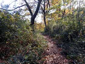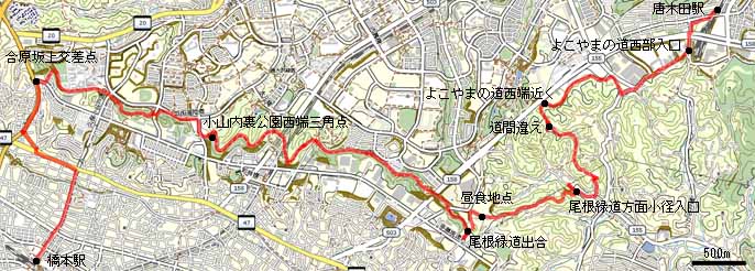 2021年11月29日(月)晴 唐木田駅1109…よこやまの道西部入口1118…よこやまの道西端近く1144 (120) 091 (140) 29 (166) …1149道間違え1153…1214尾根緑道方面小径入口1218…1237昼食地点1249 05 (150) 21 (101) 19 (156) …1255尾根緑道出合1258…小山内裏公園西端三角点1358…相原坂上交差点1439 06 (160) 60 (△182.4) 41 (163) …1515橋本駅 36 (142) 体力度A 神経度A+ (歩行合計約4時間00分) 【GPS記録】距離13.1km 【地理院地図累積標高差】上り290m 下り268m ◇5万図 八王子 よこやまの道は以前、若葉台から唐木田まで歩き、その後、唐木田以西が完成して唐木田から歩きましたが西端まで30分ほどでしたので、その後南多摩尾根幹線道路(<158>)沿いに行き小山長池トンネルの西で尾根緑道に入りました。今回もよこやまの道西部から尾根緑道へと歩きますが、その間を田中谷戸経由で歩こうと言う計画です。よこやまの道西端近くから田中谷戸まで小径(地図の破線)、田中谷戸から尾根緑道合流点への2/3くらいまでは軽車道(地図の実線1本。実際には草がかぶったりして車は通れない状態になっている事も多い。)でそれぞれ支尾根沿いの道を行きます。地図の破線や実線一本の道は、実際に通れる状態かどうか確実ではないですが、多摩地区で遊歩道ではない道を歩くのは楽しみです。(文中、「地図」は地理院地図を指し、※は帰宅後調べて得た知見です。) 唐木田駅前からは右に出て操車場の西側を行き、<158>を渡って大妻女子大学の先で右折してよこやまの道に入りました 大妻女子大学の裏手に沿って行き、それが終わると車道(<155>)沿いとなり、更にその先では道幅が狭まって車道歩きとなりますが間もなく緑色の金網に突き当たり、<155>は左に折れ、やこやまの道の続きは右の遊歩道です。 道が<158>の南側沿いとなりしばらく行くと「鶴見川流域最高度三角点「山王塚」」の説明標柱があって、その説明文には「この山王塚跡には鶴見川流域最高度三角点「山王塚」(168m)があります。」と記されていますがここには三角点ははありません。300mほど西、長池公園内の168.1m三角点の事でしょうか。それなら、ここにある標柱に「この山王塚跡」という表記はおかしいのですが。 「鶴見川流域最高度三角点「山王塚」」の標柱。そのすぐ先で右手の<158>へ下ってよこやまの道はお終いですが、下り口から分れて左へ続く小径が今回目的の道です。 田中谷戸への小径。雑木林の下草は主に密生した笹で、それを切り開いて作られた明瞭な道ですが、やはり車道や公園内のような遊歩道を歩くよりは山道へ来た気がして楽しいです。入ってすぐの左下の眺めは樹木がワイルドに密生していていかにも沢の源流部という風情です。 小径に入って4分ほどの地点の分岐で、指導標が左を指して「小山田バス停」となっていたので東の谷に下ってしまいそうな気がして、指導標がない右へ入ってしまいましたが、すぐ怪しい感じがして、GPSと地図で確認。目的の道は左だと判り、分岐まで引き返しました(往復4分ほど)。地図によれば右も田中谷戸へ行けるのですがすぐ谷に下ってしまい、その後谷沿いの道となります。今回は出来るだけ尾根を行きたかったので、それなら左です。 その後も何か所か分岐はあったのですが、その都度確認して目的の尾根道を行くことが出来ました。やがて、樹林帯から出て送電鉄塔の脇を通れば明るく開けた耕作地の中の道となり、右へ下ると田中谷戸の車道に出ます。 送電鉄塔付近から視界が開け、右へ下る。 田中谷戸の風景。車道を上流側へ200mほど行った所の左手に尾根緑道方面への道の入口があるのですが、見逃してしまい行き過ぎてから引き返して発見(往復4分ほど)。 この道に入って地図上崖記号の上辺りまで登ると、道の右側(路肩側)は足場用の鉄パイプのような物で柵に囲われていました。しかし、徒歩で通るには十分な道幅が残っていたので、普通にその区間は通過。しかし、それが終わった先で振り返ると「関係者以外立入禁止」の表示が。片側にだけ表示があるのは変ですし、この区間通行止の意味なのか、柵で囲われた中だけ立入禁止なのかもはっきりしません。いずれにしても、もう通過してしまったので後の祭りです。 そのすぐ先で左折すると、ちょっと倒木等あってワイルドな感じ。実線で描かれていますが、道幅も小径に近いです。先ほど狭まった区間がなくても車では通行不能でしょう。その先、竹林が現れ、舗装道となりますが、やはり車の通行は困難な道幅です その後、左側が開け、斜面の耕作地や対岸の尾根を望めます。更にその先では完全な車道に合流。突当りと言うか合流しての左手は割と大き目な施設「こころのホスピタル町田」(※脳病院っぽい。)があります。 田中谷戸の辺りですでに12時を回っており、とっくに昼食にしたかったのですが、ここまでベンチなどの適当な場所がないまま食べずに来てしまいました。座って弁当が食べられそうな場所を物色しながら歩いて行くとと、「こころのホスピタル町田」駐車場