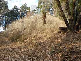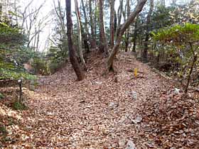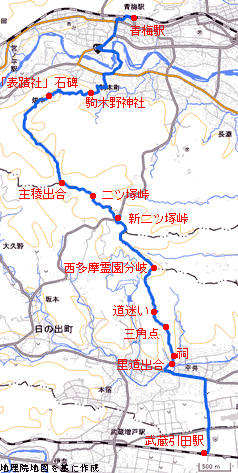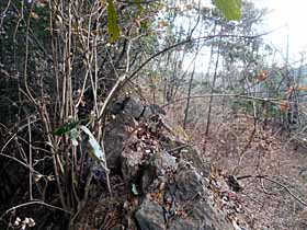 以前、馬引沢峠の東から北側の尾根に入り、365m峰〜350m圏峰と尾根を辿ったのですが「表蹟社」と記された石碑のある320m圏峰(350m圏峰側鞍部からの比高は2〜3mほどの肩のような場所)から先、300m圏峰〜270m圏峰への道が判らず谷沿いに青梅方面へ下山しました。そこで、今回、270m圏峰東麓の神社記号側から登って前回未踏部から石碑ピークへ行き、前回の逆コースで「日ノ出アルプス」主稜へ。下りにも個人的未踏のルートを歩きたいので、主稜に出たら東へ辿り、西多摩霊園方面への道の311m標高点付近から南へ谷戸川左岸の尾根に入り、途中破線(小径記号)が途切れた部分を尾根沿いに繋いで、240.9m三角点峰を通って南下、下山しようと言う目論見です。 今回は、序盤と終盤に未踏区間があってささやかな冒険心がくすぐられるコースです。(文中、「地図」は地理院地図を指し、※は帰宅後調べて得た知見です。) 青梅駅の弁当屋で昼食用弁当を調達し、右方へ歩き始めます。朝、ごたついて出遅れたので出発が昼過ぎになってしまいました。何事もなければ明るいうちに下山できる歩程ですが、未踏部を含むので果たして完歩出来るのか!?。でも、最悪、前途を打ち切ってもエスケイプ容易なのが里山のいいところ。 青梅市文化交流センター交差点から万年橋方面へ南下。道は右カーブして、正面に大岳山を見ながらだらだら下りますが、「郷土博物館 ←」の標識を見て左折。万年橋経由の方が高度ロスが少ないのでそちらのつもりでしたが、こちらも見た目大した下りでもないので「公園を通ったほうがいいや」と気が変わり、釜の淵公園の歩道橋・柳淵(りゅうえん)橋で多摩川を渡りました。公園内の遊歩道から「かんぽの宿」前の舗装道路に出ました。 舗装道路に上がって柳淵橋を振返る。地図とGPSを頼りに適当に道を拾って地図上神社記号を目指せば、石段下に到着。鳥居の右に「村社駒木野神社」と彫られた石柱がありました。 駒木野神社の石段。やや長い石段(※標高差約25m)を登りきると社殿がある平地に出ました。ここで昼食休憩。残念ながらベンチ等はないので社殿右脇の縁側に腰かけさせてもらって弁当タイム。人の姿が皆無なのは幸いでした(^^;。 駒木野神社の社殿。社殿の右奥に明瞭な登路発見。登って行くと260m等高線付近の小平地に祠がありました。ここが駒木野神社の奥宮かなと思いましたが、その先も明瞭な道が続いています。 奥宮?。程なく270m圏峰山頂に登り着くとそこにも祠が。こちらが奥宮ならさっきのは中宮かな?。(※Yahoo!地図情報ではここは「あたご神社」。) とりあえず、未踏だった1峰に登頂達成。 こちらが奥宮ならさっきのは中宮?。ここからの下りは、今までほど整備された道ではないものの普通の山道ですが、落葉に覆われているのでスリップに注意が必要です。 鞍部からは右に下る道が分岐しますが勿論尾根を行きます。その先の登り道にはトラロープがあり、ざらざらと滑り易く、捕まれる立木も少ないので、これにかなり頼って登りました。下りだったらビビるような所で、前回こちらに来られなかったのは良かったかも。 急登が終わった先の左側からはがけ記号の下方を覗き込むことが出来ました。採石場のように見えます。(※青梅建設発生土再利用事業所 (株)冨士土木 青梅工場。多摩地域の建設残土の処理場のようです。) そこからは緩斜面の尾根で道は不明瞭になりますが、左は崖で、そちらなら間違えて下ってしまう恐れもないので、判りにくい時は左寄りに行く感じで進むと、右手に比高2〜3mほどの露岩の高まりが出現。300m圏峰の頂陵部と思われるので登れそうな所から登ってみました。僅かな距離ですが、しっかりした木の根などがなく、足を置く窪みには滑り易い砂があったり、手がかりの岩角ももろいのでビビりながら登りました。 300m圏峰の頂稜部は岩。テーブル状の地形を期待していたのですが、登ってみるとくさび状の痩せた岩稜でした。左右似たような高さのギザギザが続き、どこが最高点か判りませんが、ビビって立つ事も出来ないので、頂稜上を歩くのは諦め、「ほぼ登頂」と言う事にして尻を着きながらおどおど下りました。 登ってみるとくさび状の痩せた岩稜。その先の鞍部付近の尾根は平坦ですが藪っぽくなりました。石碑ピークの手前は急斜面で、尾根沿いに行くなら左側ですが完全なヤブなので右へ行くとはっきりしたトラバース道となり、いい道(前回下った道)に合流しました。道なりに僅かに登れば「表蹟社」石碑ピークに到着。さっきのトラバース道はいい道側から見るとあまりにも地味で、前回分岐を発見出来なかったのも「さもありなん」と思いました。 「表蹟社」石碑ピーク。ここまでで本日の第1の核心部は無事通過しましたが、16時くらいまでに里に出たいので先を急ぎます。 350m圏峰前後の多摩川側はかなり広範囲な伐採地となっており、青梅の市街地とされ囲む山々が見渡せ、その奥の大岳山や川苔山は印象深く眺められ