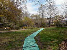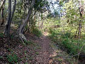 秋川丘陵と言う名を知ったのは「文献登山ガイド 12 東京都の山」(1994 紀村朋子 他)で、紹介されているコースは、サマーランドの南から雹留山西の鞍部まで尾根を辿った後、北へ下るものでした。尾根はさらに西へ小峰公園上部を経て沢戸橋近くまで続いていて、それを辿った事もありますが、その後、雹留山西の鞍部〜小峰公園上部東端が通行禁止になってしまったようです。 ところが実は、それ以前から東京都制定の「かたらいの路 秋川丘陵コース」では沢戸橋までコースは続いており、現在の通行禁止部分は北側を迂回して、網代弁天山・城山を登り下りしてから小峰公園上部へ登っていたのでした。 と言う事で、今回、その部分は「正規ルート」を、尾根通しの時とは逆向きに沢戸橋から辿る事にしました。(文中、「地図」は地理院地図を指し、※は帰宅後調べて得た知見です。) 武蔵五日市駅から沢戸橋まではバスの便もありますが、今回も含め(何回か刈寄山に登った時にも)たいていは街並みを見ながら歩いています。正面に見える城山も峩々としていい感じです。 沢戸橋東より戸倉城山。沢戸橋を渡ってすぐ左が小峰公園方面への入口ですが、そのまま次の橋(※新久保川原橋)へ進んでしまい、沢戸橋西端近くまで戻って左側を下って行く道に入りましたが、これも新久保川原橋の下をくぐった先で最初行きかけた道と合流していることに気が付いてまた戻りました。で、改めて見たら脇にハイキングコースの入口がありました(^^;。 川の近くまで下って、歩道橋を2本渡るといよいよこれから辿る尾根の西端です。ここからまずは日向峰(すぐ東の323m峰)を目指します。「かたらいの路」公式ルートから少し外れますが、前回逆コースで日向峰に寄った時、こちらへ尾根通しに下らず、本線へ戻って下ったので、今回は尾根通しに登ってみたかったからです。しかし、それらしく見えた入口を進んでも尾根には向かわず、結局は本線に合流してしまいましたので、もっと草の枯れた季節に再チャレンジすることにして、今回も諦めて本線を進みました 植林帯の山腹道を登って行くと、日向峰への分岐辺りからは尾根沿い(稜線の僅か右側)となります。その先、新多摩変電所方面へ下る道を見送って左へ登って行けば、明るい灌木帯で、道はまさに尾根上となります。 尾根上明るい灌木帯となる。その先、また樹林帯になりますが、右側が伐採され、変電所のかなりの部分が見下ろせる場所もありました。更に尾根を登って行けば336m峰です。ここは小峰公園上部の西端で、小峰公園の最高点、秋川丘陵コースの最高点でもあります。 小峰公園最高点(336m峰)。道は次のピークの北側を巻いて、小峰公園上部東端の三差路に達します。右は雹留山方面への尾根沿いルート(通行禁止)、左は北側へ下る支尾根の道でそちらへ。 僅かに下って僅かに登り返したピークは台地状に均され(「展望広場」)、四阿があります。ここで、弁当タイムにする予定でしたが先客がありましたので通過。 食事予定の展望広場四阿には先客あり。その先へ僅かに下った所にベンチ・テーブルがあり、無人だったのでそこで弁当タイムにしました。この辺り広めに切開かれていますし低木主体なので明るい場所です。 四阿の先のベンチ・テーブルで弁当タイム。好展望でもないので、食事が済んだら休憩は早めに切上げて、尾根を道なりに下って行きます。この辺り、「かたらいの路」公式ルートは一本西側の尾根道ですが、公園内を並行する道ですから、コースアウトしたと言うほどの問題ではないでしょう。ほぼ下り切ったら左へ。ここは公式ルートの尾根との間の谷の開口部で、広めの平坦地(※「けやき広場」)に敷かれた明緑色のゴムマットの道を行きました。 小峰公園下部のけやき広場。その先はトイレの脇を通ってすぐ出口でした。車道沿いの歩道を左(北)へ行くと右へ分岐のある三差路のすぐ先左手に小峰ビジターセンターの入口があり、その手前に「かたらいの道 秋川コース」の案内板がありました。 「かたらいの道」案内板前より小峰ビジターセンター。ここから網代城山の入口辺りまでのルートが判りづらいと思って案内板を見ると、ここから東へ向かっている感じでした。しかし、今いる位置から東側を見ても小径あるいは遊歩道の入口らしきものが見当たらないので、三差路から東へ分岐する車道に入りました。すると、すぐ先の左手駐車場の奥から登って行く小径があったので、それを登って低い尾根上の遊歩道に出ることが出来ました。しかし、遊歩道はもっと左(西)から始まっています。つまり、小峰ビジターセンターの前に本来通るべき入口があったと言う事です。地図をより見ると、案内板から少し(※30mくらい) 北へ進んだ位置に低い尾根上の遊歩道の西端入口があります。(※しかもそこは、以前、駅から直接城山へ向かった時に入ったことがある入口でしたT_T)。) 低い尾根に乗ると、左「小峰公園」、右「高尾公園」