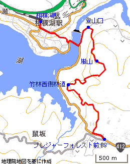 2022年5月2日(月)晴たり曇ったり 相模湖駅1034…1050登山口1053…1125嵐山1145…竹林西側林道1225 (201) 16 (180) 32(△406.0) 40 (245) …1304プレジャーフォレスト前BS 39 (221) 体力度A 神経度A (歩行合計約2時間15分) 【GPS記録】距離4.9km 【地理院地図累積標高差】上り409m 下り389m ◇5万図 上野原 |