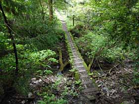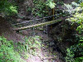 相模湖畔の嵐山はお手軽なショートコースですが、前回行ったのが95.05.14なので、記憶的には新規に近く、また行ってもいいかなと。(文中、「地図」は地理院地図を指し、※は帰宅後調べて得た知見です。) 相模湖駅前からR20を左(東京方面)へ行き、左へカーブする手前のY字路から右の細めの車道へ入ります。道なり緩く下って行くと眼下に相模湖大橋が見えます。橋とは標高差があり車道は右へカーブしてしまいますが、その手前の左手の階段を下りれば橋のたもとに出ます。 ここまで車道(R421)は、駅前から相模湖畔へ下り、湖岸沿いにここへ来ていますが、徒歩なら上記ルートの方が近道です。 相模大橋より相模ダムと景信山方面。橋を渡った突当りでR412は右折しますが、逆の左の道へ。左手相模ダムの少し先右手に嵐山への登山口があります。 嵐山登山口。小径に入って急斜面をジグザグに登れば少し傾斜が緩んで尾根上っぽい場所に出ますが、その先少し左へトラバースした後、尾根沿い道となり、美林もある中を頑張って登り切れば、三角点標石や説明板・テーブル等がある嵐山山頂です。テーブルに腰かけて弁当タイム。 嵐山山頂。山頂からは、相模湖の向こうに扇山方面が望まれますがその他の方向は樹木に遮られて視界は狭め。 山頂から相模湖と扇山方面の眺めです。ネットで事前に調べたコースタイムは、ここから下山の目的地・プレジャーフォレスト前BSまで1時間(そのコースタイム、駅からここまで50分は実際の所要時間とほぼ合っていました。)。バスの発車予定時刻まで1時間40分ほどもありますのバス待ちが長くなりそうですが、山頂はそれほど長居したい場所でもないので、途中、面白そうなところがあったらそこで時間をつぶす事にして出発しました。 道はひとしきり下った後、プレジャーフォレスト敷地への突入を避けて、右側の山腹道となり、沢を渡ったり小尾根を乗越したりで、結構アップダウンがあります。 沢を渡る部分には木橋がかけられており、欄干はなく狭めなので慎重に渡って行きます。二つ目の木橋は歩調に合わせて少し上下に揺れたので、若干ビビりました(^^;。 二つ目の木橋。その先、元の道が崩れているのか、左へ高巻くようなう回路を通りました。 その後、竹林を通って、林道仕様の道に出ますが、少し左へ行って右へ折れる所から正面小径へ。 四つ目の木橋は鉄パイプで補強されており、左側には鉄パイプの手摺があって安心です。 四つ目の木橋。五つ目の木橋を渡った後、小尾根沿いの道となり、左下にプレジャーフォレストの駐車場を見下ろした後、右下に老人施設の駐車場を見下ろし、その先墓地があった後、歩道橋のたもとからバス通り(R412)出ます。 道なりに100mほども行けばプレジャーフォレストの入口手前に三ヶ木方面へのバス停がありましたが、相模湖方面のバス停は道を渡って50mくらい先でした。 特に時間調整もしなかったのに嵐山からプレジャーフォレスト前BSまでは1時間20分ほどかかりました。それでも、バスの発車予定時刻まで20分ほどあり、バス停ベンチには既に先客がいたので、すぐ横の赤鳥居をくぐって石段を登り、八幡神社境内のベンチで時間調整しました。 嵐山の前後で印象に残ったのは、斜面が急になるほどジグザグの角度が小さくなって道の勾配を保とうとする親切設計が徹底している事でした。超お勧めとは言えませんが、お手軽なショートコースとして他に行きたい場所が思いつかなければ候補に入っていいコースです。 ▲項目索引▲ ◎トップページへ戻る◎ |