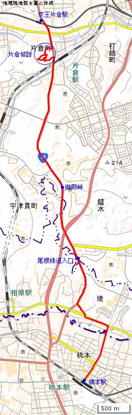 本日は、京王線の一日切符を利用して沿線を散歩。まずは京王片倉駅から橋本駅までR16沿いに行き、途中、半袖で快適に登れそうな丘があったら寄って行こうと言う算段です。(文中、「地図」は地理院地図を指し、※は帰宅後調べて得た知見です。) 京王片倉駅は北口しかなく、R16へ出たら南へは線路をくぐって行きます。湯殿川を渡ると右手に「片倉城跡」の標識発見。早速入ってみることに。 ![]() 池の畔を通って左折し、長い石段を登った後左へトラバースし、右へ石段を登れば住吉神社の社殿前に出ます。 初めの長い石段。 住吉神社の社殿。社殿脇から奥を進めば、二の丸広場。ソフトボールが出来そうなくらいの広さですが芝が深くて草原の趣き(球技禁止)。ここは、湯殿川と兵衛川に挟まれた平べったい尾根の東端近くです。 広場の西端へ行けば目に入る西の尾根続きは農地で、その奥に奥高尾の山も望めます。 二の丸広場。東へ転じてほぼ同じ高さ(※標高は二の丸広場140m、本丸広場138mくらい。)の本丸広場へ。ここも草原風ですが二の丸広場より二回り以上狭く、樹林に囲まれてやや閉塞感があります。 。本丸広場の北東端へ行った後、南西端南側からの下降路を下り、東進してR16に出ました。 ここからR16沿いの歩道を御殿峠まで標高差80mほど登って行きます。 左前方に屋上にピラミッド状の構造物がある建物が目立って見えます。道端に黄色い花が目立っていたので、きっと聞いたことある名前の花だろうと思って、帰宅後調べるために写真に撮りました。(※調べたら「キンシバイ」という聞き慣れない植物でした。) 道端のキンシバイ。門の前まで来て看板により、先ほど目立って見えたた建物は「東京工科大学」敷地内のものと判明(※片柳研究所棟)。更に進むと左手眼下にバイクだらけの駐車場。その先の門前の標識でここも東京工科大学敷地と判明。繋がっていたのか。広すぎる。(※先ほどの門が正門、こちらは西門。R16が敷地と接する距離は900mくらいあります。) 更に少し進んで、大学敷地南端を過ぎるとようやく前方が下りになり、ここが御殿峠です。 北側より見た御殿峠付近。あとは橋本駅まで下り〜平坦と思いきや、鑓水交差点から相原坂上交差点まで(途中から尾根緑道に入って、小山内裏公園〜多摩境駅を目指すのも一興。)や、境川を渡って橋本駅まで、それぞれ10mを超える登りがありました。 結局、寄った丘陵地は片倉城跡のみでしたが、それなりに面白い場所でしたし、メインの御殿峠越えは意外とスケール感あって、達成感のある散歩になりました。 ▲項目索引▲ ◎トップページへ戻る◎ |