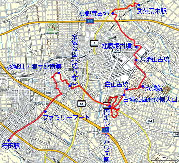 2023年11月2日(木)晴 武州荒木駅0831…0852真観寺古墳0857…0927地蔵塚古墳0937…0949八幡山古墳0955 (19) 21 (25) 30 (23) 12 (19) …1017成就院三重塔1020…1030白山古墳1036 22 (18) 10 (22) …1042古墳公園北東側入口(この間、公園内散策・11:17-12:07食事休憩)円形レストハウス前1248 06 (17) (丸墓山古墳△35.7) (18) …1305水城公園(切り株)1325…1339忍城址・郷土博物館1445…1521ファミリーマート行田持田店1530 17 (18) 14 (21) 36 (19) …1556行田駅 26 (20) 体力度A+ 神経度+A (さきたま古墳公園内を含む歩行合計約5時間10分) 【GPS記録】距離19.6km(さきたま古墳公園内を含む) ◇5万図 熊谷 □筆者参考文献 「首都圏ハイキング '98秋冬号」(山と渓谷社) |