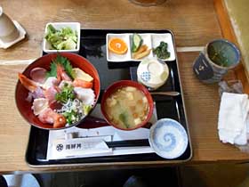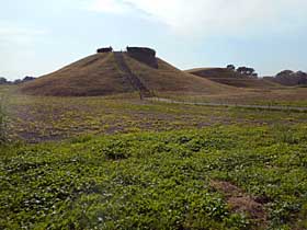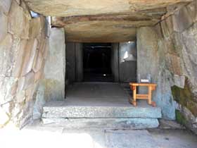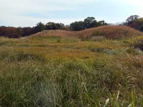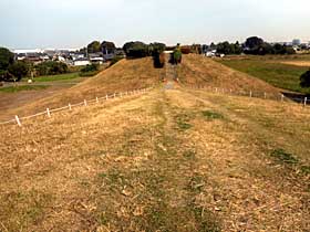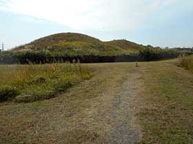 さきたま古墳群は06.01.29に巡ったのですが、その時は午後からの行動だったので参考書に示されたチェックポイント(古墳等:以下CP)を一部割愛しましたし、さきたま古墳公園内も2つの古墳に登るにとどまりました。そこで、今回再訪し、参考書に示された順にすべてのCPを辿り、公園内ももう少し歩き回る事にしました。(文中、単に「地図」との表記は地理院地図を指し、※は帰宅後調べて得た知見です。) 武州荒木駅。秩父鉄道・武州荒木駅から北側の<7>を西へ辿ります。第1CP・真観寺古墳は見沼代用水を渡って道が左へカーブした先の左側にありますが、手前から裏道に入ったので古墳の裏側から墓地との境を時計回りに辿って入口に着きました。 真観寺古墳入口。登ってみると、右に後円部、左に前方部があり、それぞれの頂上に行けました。 左・前方部 右・後円部。さっきの裏道から南方向へ道を拾って、R125の高架をくぐり、秩父鉄道の踏切を渡って農道のような道を南東方向に進みます。 左手に龍泉寺の入口を見て150mほど先を右折。<128>を横断して、次を左折、少し行けば右手に第2CP・地蔵塚古墳がありました。時計回りに入口へ回り込みます。 地蔵塚古墳。登って見れば4基の石地蔵が入った小屋と格子戸で閉ざされた祠がありました。下りて、脇のベンチで小休止。 古墳へ来た道に戻り、そのまま進めば歩道付きの道に突当たるので右折。左手に工業団地を見ながら進みます。「株式会社ニッコー 埼玉工場」の先の左折路手前に「← 八幡山古墳」の標識があるので左折、3本目の右折路の左側に「→ 八幡山古墳」の標識があるので右折、少し先の左手に本日の第3CP・八幡山古墳(参考書では八幡塚古墳。参考書の図示する場所より100mくらい北にある。)の入口があります。ここへ入り、左へ回り込めば石室の正面。 八幡山古墳。石室の入口を閉ざす縦格子の隙間から石室内を覗いてみました。 。今回は登るのは遠慮して、ここを後にします。 南西方向で突き当たった道を左折、広い道を渡って水路沿いに南東へ進みます。この道、歩道完備なのですが草だらけなので仕方なく車道を歩きます。交通量が少ないのが救いです。 歩道は草だらけ。道が緩く右カーブした後、左カーブするところで右折。広い田んぼの間の道を行き、奥に見える集落を目指します。 集落に入ってもそのまま進み、奥に鉄塔が見える道へ左折。鉄塔の近くへ来ると右斜め前に三重塔が見えるので、鉄塔の角を右折、やや広い道へ出たら左折して側溝の蓋の上を歩いて行けば成就院入口。中に入って第4CP・成就院三重塔の写真を撮りました。 成就院三重塔。成就院前の道を右へ行き、先ほど田んぼの中から来た道が右から出合う僅か手前で左折、すぐの右折路に入って進めば、2つ目(舗装道同士としては1つ目)の十字路を右折した右手に鳥居があり、その扁額からここが第5CP・白山姫神社と確認できます。中の説明板では「白山古墳」となっており、登ってみると古墳の上に祠が鎮座しています。 白山姫神社。 白山古墳の上には祠が鎮座。白山古墳を辞して、鳥居の前の道を右へ行きすぐ左折して道なりに行けば藪の奥に前方後円墳らしき小山の連なり(※将軍塚古墳)が見えて来ます。突当たってすぐ右前方へ進めば旧忍川を渡ります。突当たった道を少し右へ行けば第6CP・さきたま古墳公園の入口です。 さきたま古墳公園の北東側入口付近より稲荷山古墳。まずは稲荷山古墳を縦断します。 稲荷山古墳後円部より前方部。 同前方部より後円部。その後はいそいそと南下。 南東側より丸墓山古墳を見る。 北側より二子山古墳を見る。古墳通り(<77>)へ出たら左へ行き、公園すぐ東側の食事処「一寸一」へ急ぎました。ハイキングで昼食は大きな楽しみですが、今回は弁当持参ではなく、ネットで見たこの店の海鮮丼が最大の楽しみだったりするのです(^^;。 しかし、開店時刻の確認をうっかりしていました。11時開店かと思ってたら11時30分開店でしたT_T)。仕方なく、先に、公園の<77>より南側のエリアを周って来る事にしました。 <77>を少し西に行った所から入ります。しかし、少し進むと正面と右側は柵、左側は草刈作業中。左側は何とか行けそうなので作業の脇をすり抜けて行きました。 外周部に近い道を反時計回りに周って、奥の山古墳や鉄砲山古墳を見物しました。 北西側より奥の山古墳を見る。 東側より鉄砲山古墳を見る。再び、一寸一へ行きましたが、まだ開店まで10以上ありましたした(^^;。開店後も、出来て来るまで10分以上待ってようやく、海鮮丼にありつけました(^_^)。 食事処「一寸一」の海鮮丼。筆者の個人的な食事1食分としては破格の1,890円(ネットで見たときは1,370円でしたから大幅値上がり。最近、刺身もその他の食材も滅茶苦茶値上がりしているので、まあ納得。)支出ですが、たまには贅沢もいいでしょう。十分堪能して店を出ました。 昼食後は公園内に戻り、南側から丸墓山古墳に登りました。さきたま古墳公園には古墳