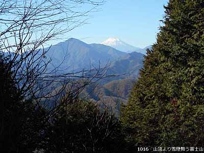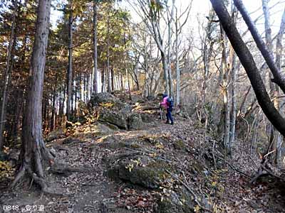 今回も比較的近場で展望の良い山と言う事で石老山。前回(96.12.07)からだいぶ経つので、新鮮な気分で登れます。前回同様、大明神展望台に早く着く様に、ガイドブックに多く紹介されているコースを逆コースで辿りましたが・・・。(文中、単に「地図」との表記は地理院地図を指し、※は帰宅後調べて得た知見です。) 相模湖駅から三ヶ木方面へのバスでプレジャーフォレスト前下車、目の前でバス通り(R412)から分岐する車道(<517>) に入って行きます。しばらく行って左の谷沿いの道に入るはずでしたが、通行止め。ここも、令和元年東日本台風被害未復旧か。指導標「大明神展望台登山口 0.6km →」に従って、更に車道を辿る事になりましたが代替ルートが近くにあったのは不幸中の幸い。やがて登山口に着きました。 ![]() 階段から始まり、尾根をグイグイ登って行く道は、従来の谷沿いの道より好みですので、ルート変更は怪我の功名かも。 ![]() 小さなコブはあったものの比較的効率的に高度を稼いで、お目当ての大明神展望台に登り着きました。 しかし、立木に遮られて肝心の展望は景信山周辺のみT_T)。前回から27年も経つので木も育つでしょうが、「展望台」を謳う観光資源なので、視界確保のための伐採は行われていると思ったのですが。 ![]() この先もすっきりした展望が得られる地点はなく、樹間にちらちら白富士を眺めては登って行きます。祠のある大明神山(551m標高点峰)から始まっていくつかの低いコブを乗越えながら高度を上げて行き、最後に木で土止めした階段状の道を登り切れば、東西に細長い石老山山頂部の西端です。 少し進めば694.4m三角点。 ![]() 山頂(最高点)は更に120mくらい東です。 ![]() 山頂は木に囲まれていますが山名標柱付近からはなんとか富士山(と左手前の加入道山・大室山等)は見る事が出来ました。白富士は強風で雲と見紛う雪煙をまとっていました。 ベンチ兼テーブル?が多数設置されているので利用して弁当タイム。 ![]() 僅かに西側へ戻って北側へ下ります。ここまで思ったより短時間で来たので、当初予定だった石老山入口13:23発の一本前、12:08発のバスに乗れそうです。 すぐに低いコブを越えますが、あとはほぼ下るばかり。途中、「融合平見晴台」があって少し後ろから見る感じ相模湖が見下ろせ、その先に笹尾根東部等も見えそうですが、ここの視界も枝がうるさそうな感じで、狭い場所に先客もいたのでパス。 更に下った八方岩からは近くの尾根の左側、平野の端にモコっと頭をもたげる津久井城山が目に付きました。(※地図を確認したら、その右手前に津久井堂所山、405m標高点峰(ググったら平代山)。堂山の左鞍部奥は小倉山、平代山の右奥は雨乞山か?。) ![]() この辺から、名前の付いた岩等、説明板の設置された場所が次々と現れますが、バスを遅らして見学する気が起きなかったので全てパス。 下り着いた顕鏡寺の公衆トイレに寄って最後の休憩。バス停まで30分見てもまだ余裕がありました。 ![]() ここからも、まだやや急な部分はあります。水が流れていたり、ぬかってたりして滑り易い場所もあるので足元に注意して下ります。 やがて、左金網フェンス沿いに進んで里道に出会いますが、こちらの登山口は標識もなくショボい感じ。と思ったら、その先、階段を下りて舗装道路に出合った所に登山口の標識がありました。左へ道なりに12分ほどでバス通りに出合い、その交差点のすぐ左に石老山入口BSがあります。相模湖駅へのバスは定刻に来ました(^_^)。 残念ながらすっきりした大展望が得られる場所はありませんでしたが、山名に相応しく苔むした岩だらけの道が随所にあって、楽しい山行が出来ました。今回はハイキングのみでしたが、顕鏡寺の周りの文化財をいちいち見て歩けば文字通り「物見遊山」として複合的に楽しめると思います。 ▲項目索引▲ ◎トップページへ戻る◎ |