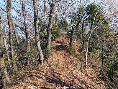 陣見山へは97.01.25に不動山から歩いたのですが、東へ尾根を辿り、波久礼駅へ下る予定だったのに、「ハイキングコース」の指導標につられて児玉方面へ下ってしまいました。なので、今回、久々に陣見山へ行くに当たっては逆コースで、その時未踏に終わったルートを登りに使いました。陣見山から先、逆コース完歩が時間・余力的に困難であれば、適当な所から下るつもりです。(文中、単に「地図」との表記は地理院地図を指し、※は帰宅後調べて得た知見です。) 地図を見ると波久礼駅の裏手の尾根へは駅の少し北から190.7m三角点付近へ道がありそうだが、手持ちの複数のガイドブックが、南へ行き、尾根の末端から辿るルートを示しているのでそれに従う。 駅前(線路西側)のすぐ南で線路を渡り南下。少し先で亀の井ホテル方面へ左折して道なりに登って行けば、ホテルの左から指導標が「円良田湖」を示す小径に入る。 ![]() わずか先、円良田湖方面へ尾根を横切る地点に左へ尾根道の分岐がありそれに入って登って行く。 190.7m三角点付近で左側を見たが、明確な道は見当たらず、やはり尾根末端から登ったて正解だったようだ。 一登りした250m圏には石祠があり、賽銭と見られる少額硬貨が溢れるように供えられていた。 ![]() ミツバツツジも見られる尾根道を進み、310m圏峰の西側、300m圏を登り下りするが、その前後も小さめのアップダウンを繰り返す。 ![]() ![]() その後、木で階段状に土留めされた急登を頑張れば小平地に着き、そのすぐ先のピークが虎ヶ岡城址で、山頂は小広く均され四阿もある。 ![]() ここで休憩して時計と計画表を見ると、かなりのタイムオーバー。このペースでは日が暮れてしまいそうで早くも不動山到達断念が決定的に。 いくつかコブを越えながら高度を上げて行く。途中368.4m の三角点は気付かず通過。 500m圏峰の先の鞍部で車道を横断し、最後の一登りで陣見山山頂。取敢えず、今回の主目的達成。 ![]() 朝食が早かったので、弁当タイムにしてもいい時刻になっていたが、テレ玉の中継局施設がある山頂は展望皆無であまり気分の良い場所ではないので、休憩だけで出発。 陣見山の西の鞍部は車道が通っていて、そこからは近景の桜と共に南面・長瀞方面の展望が得られた。 ![]() 再び小径を登って行きいくつかコブを越えながら昼食適地(平坦で切り株等座れる物がある場所)を探すが見つけられないまま車道が通る榎峠へ。 付近を探したが椅子代わりになりそうの物がない。仕方なく、また小径に入って登って行くと485m標高点峰付近で横たわる丸太発見。これをベンチ代わりにして、ようやく弁当タイムにあり付けた。 ![]() 曇って来たので榎峠へ戻っての下山も考えたが、食事が済むと何だかやる気が出て来て、好展望の雨乞山へ向かう事にした。 先へ進むとすぐ車道に合流。この先、車道は尾根沿いに行くがピークは左側を巻いて行く。車道が巻く区間は小径(「ハイキングコース」の指導標あり)が稜線を辿っているが、名のあるピークや展望地もなさそうなので、今回は平坦で楽な車道のみを行った。 その後車道は登りとなって雨乞山(510m標高点峰)到着。南面に展望が得られる。休憩後、更に車道を辿る。 ![]() 緩く下って行くと右に下る小径が分岐。GPSと地図で間瀬峠へ下る道と確認して、それに入る。気分の良い落葉樹の道を下って行けば間瀬峠に着く。 ![]() すぐ先で近道になりそうな林道は通行止め、地図上その先から左に分岐する小径も入口発見できず、そのまま県道を下る。 車は10分に1台くらいしか来ないし、展望地もあるし、沿道に桜は多いし、スミレの群落も見られ、県道の下りは意外に楽しめた ![]() ![]() ![]() 山麓まで下れば射撃場入口交差点でR140に突当たる。 地図を見るとここからは右・野上駅(※約1.3km)の方が左・樋口駅(※約1.5km)より僅かに近そうだが、寄居経由で帰るので、樋口駅を目指す。(西武線沿線住民なら、野上駅から御花畑・西武秩父経由が好適。) ![]() 樋口駅へ向かうR140からは正面に陣見山が見え、辿って来た道の長さを実感出来た。天候は悪化の一途と思われたが、この頃は再び薄日も射すようになっていた。 ![]() R140に入って樋口駅までは意外と長く感じる車道歩きだった。 今回のルートではコース中、藪は全くなく、迷いそうな所もありませんでした。前回の拙記録を読んでも、藪は不動山周辺のみだったようです。尚、それによれば不動山は好展望でしたが、最近のネット記事を読むと展望皆無のようです。 ▲項目索引▲ ◎トップページへ戻る◎ |