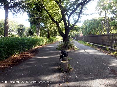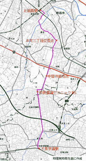 夏の低山ハイクは暑くてきつそうですが、朝散歩程度ならならバテずに歩けそうです。(文中、単に「地図」との表記は地理院地図を指し、※は帰宅後調べて得た知見です。) 大泉学園駅北口のテラスからは、ビルの隙間この季節にしては意外にくっきりとに山が見えました。 ![]() バス通りをどんどん北上。途中「風致地区」なんて名前の交差点がありちょっとびっくり。 やがて、都民農園セコニックBS。2つ手前の都民農園BSは都内ですがここは埼玉県です。なのにバス停に面した「いなげや」は「大泉学園店」。ここは始発・終着のバスも多いバス停ですが、ターミナル状ではなく普通に路上のバス停で、折り返し場所は別にあるようです。 その先突当りは右へ。道は左カーブして左右広大な自衛隊施設の間を北上するようになります。この辺りの歩道、しばらくは緑道仕様になっています。 地図上で計測した本日の歩程は約8.5kmなので、GPSのトリップメーターが4.25kmを示したあたり、切り株型の擬木の腰掛で中間点休憩。 ![]() R254を渡るとその先は朝霞中央公園で、野球場が見えたのでちょいと覗いてみたらセンター120m両翼90mで現在の野球場(センター122m両翼100mが標準)としては狭いですが、昔はプロが試合する野球場もこれくらいが標準的でした。 左手に朝霞市役所を見て更に進めば本町二丁目交差点で、ここを左折。この道は「二本松通り」で、少し先の右手に由来と思われる朝霞市指定史跡「二本松」がありました。松が2本あるかどうかよく判らず、石碑(※庚申塔)に供えられた花が目立っていました。 その先、下り坂となり足が捗りますが、太陽が背中方向なので日影が少なく、暑かったです。 溝沼六丁目交差点の先は下りが顕著なので、前方にビルの上階が水平方向に望まれます。 ![]() 坂を下り終わり、黒目川を渡れば、右手に「JAあさか野」を見てその先弁財坂下交差点を右折。 東上線をくぐって渡り、左折。隣接する駅が朝霞「台」と言うだけあってここ(川べりの高さ)から北朝霞駅へは登りをひと頑張りしなくてはなりません。 平野部の散歩ですが、緑道や公園もあって楽しく歩けました。ちょっと出遅れたので日差しも強くなり、終盤日影が殆どなくて暑かったです。夏は逆コースの方が、後半日影が多くなるので楽かも知れませんが、累積標高差も距離も大したことないので、炎天下の時間帯でなければ給水をしっかりしていればどの道バテる心配はないでしょう。 ▲項目索引▲ ◎トップページへ戻る◎ |