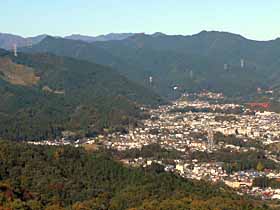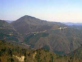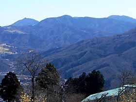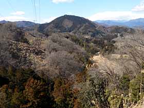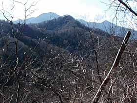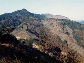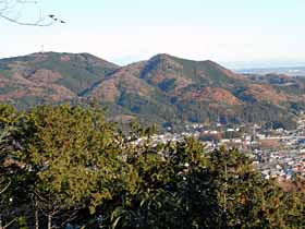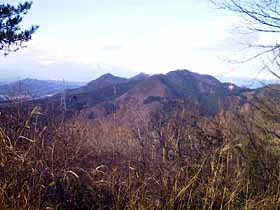 | 085 | 足利行道山(石尊山442) | 行道山浄因寺駐車場(220)−石尊山−両崖山(251)−織姫神社(110)−足利市駅(35) (95.01.21) | 行道山は浄因寺の山号で、そう言う名のピークは無い。標高も低く、歩程も短いコースだが、展望も良く、見所も多く、非常に中身の濃いコース。両崖山から織姫神社方面への下りには、露岩に松という乙な風景もありるし、織姫神社上部の公園や神社の建物は異常に立派。超低山の割に東京から比較的遠く、また、往きは足利市駅からタクシーを使うが、十分にその値打ちはある。![]() 275m三角点峰への登りより大岩山、右奥に石尊山。 |