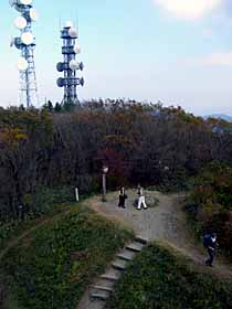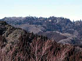 | 095 | 難台山(553) | 岩間駅(41)−愛宕山(306)−木製展望塔(382)−難台山−吾国山(518)−福原駅(60) (01.12.31) | 愛宕山−難台山−吾国山は冬場、あまり人に会わずにのんびり歩けて、標高差も歩行距離もほどほどの割に大縦走気分(?)の味わえるコース。 最初の愛宕山にある愛宕神社は地元では有名観光地。愛宕山の南から西に向かっていた尾根道が、北西に折れ曲がる地点(南山)の木製展望塔からは、愛宕山、霞ヶ浦、筑波山などがよく見える。難台山の山頂は、オブジェのような展望盤も設置されているが、展望が開けているのは筑波山方面だけ。吾国山山頂には一等三角点があり、田上神社の裏手の土柵の上からは、難台山や筑波山群の展望が抜群。 ![]() 吾国山より難台山。 |