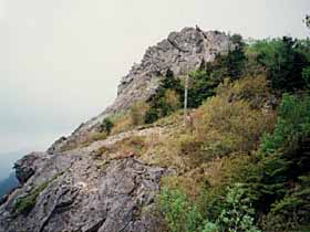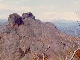 | 045 | 羅漢寺山(弥三郎岳1058) | 昇仙峡滝上BT(699)−羅漢寺山分岐(807)−パノラマ台駅前(1020)−弥三郎岳−白砂山(981)−獅子平分岐(830)−天神森BS(460) (00.10.22) | 日帰りの山としてはアプローチが比較的長く交通費もかさむが、訪れてみて期待通りの価値はあった。岩と低木の景色も素晴らしいし、展望もよい。観光地のイメージが強いがハイキングにもいい山だ。 歩程例は定番と言うかこれ以外考え難いコース。 ![]() 白砂山から弥三郎岳。 |