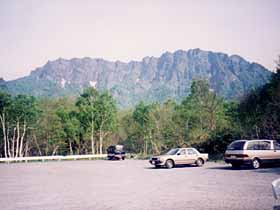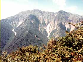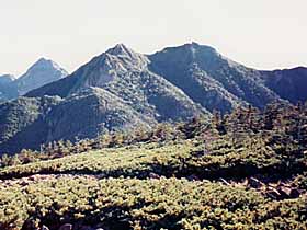 | 046 | 権現岳(2715) | 観音平(1540)−編笠山(2524)−権現岳−三ツ頭(2580)−甲斐大泉駅(1180) (94.08.28) | 夜行で小淵沢へ行って、早朝にタクシーで観音平まで入れば早朝の澄んだ遠望を得ることが出来、また比較的天候が安定している午前中に山中での行動を終えることが出来る。標高が高いので、山上では森林限界より上となり、天候が良ければ素晴らしい展望に恵まれる。甲斐大泉への下りは、非常に長く感じた。![]() 編笠山より権現岳(中央右)。 |