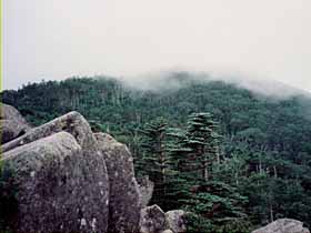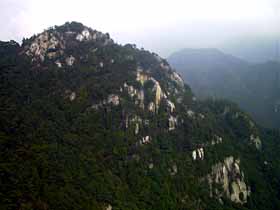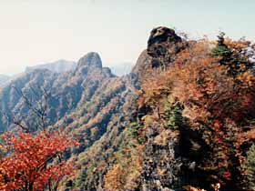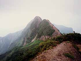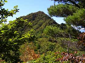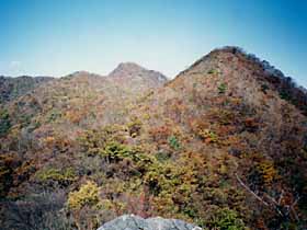 | 097 | 男体山(654) | 袋田駅(90)−四度ノ滝(130)−月居山(404)ー男体山−大円地越(500)−西金駅(65) (93.09.26) | 低山ながら岩ゴツゴツの絵画的景観はなかなかのもの。歩程例の四度ノ滝(袋田の滝)を見物後月居(つきおれ)山から尾根道を辿るのは男体山への代表的なハイキングコース。西金から直接登るなら大円地からの「健脚コース」もお勧め。「健脚」と言っても、急峻さゆえ名付けられたようで、大円地越経由より体力的にきつい訳ではない。![]() 大円地より男体山。 |