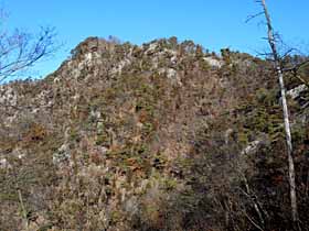 | 075 | 桧沢岳(1133) | 舗装道路最高点(730)−桧沢岳西峰(1100)−桧沢岳−東の鞍部(1040)−舗装道路最高点 (06.10.15) | 歩程は短めの周遊コースだが、山村風景、岩場やルートファインディングなど西上州の山歩きの楽しみが凝縮された山。交通の便が悪いのでマイカー(バイク)でないと東京から日帰りは困難。 根草集落の舗装道路最高点付近の登山口から、まずは西峰とのコルへ。ここまでも整備された山道に比べると高難度。コルから上は岩場。好展望の西峰へ往復した後登り着いた本峰には祠などあり、難路を荷上げした関係者の信心が偲ばれる。下山はまず、頂上岩壁下の神社へ巻き下るが、そこから先の舗装道路までのルートもわかりにくい。 ![]() 小沢岳より桧沢岳。 |